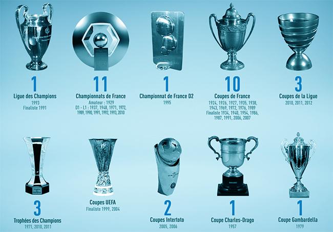- 🏆 11 titres de champion de France : 1929, 1937, 1948, 1971, 1972, 1989, 1990, 1991, 1992, 1993*, 2010 *(le titre 1993 a été retiré pour cause d’affaire VA-OM),